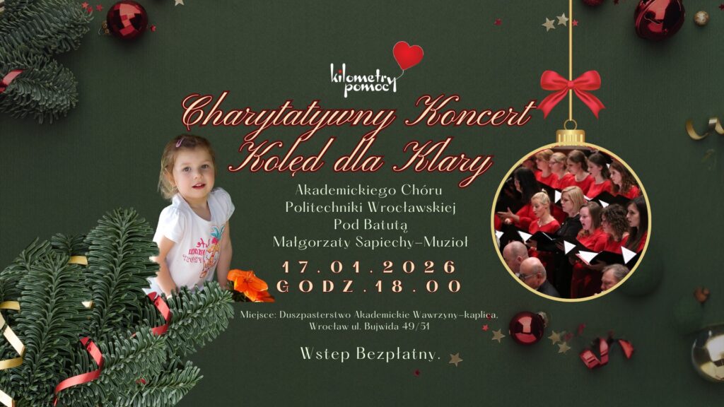 📅 17 stycznia 2026 (sobota) Charytatywny Koncert Kolęd Akademickiego Chóru Politechniki Wrocławskiej pod Batutą Małgorzaty Sapiechy-Muzioł – dla Klary. ❤️🎶
