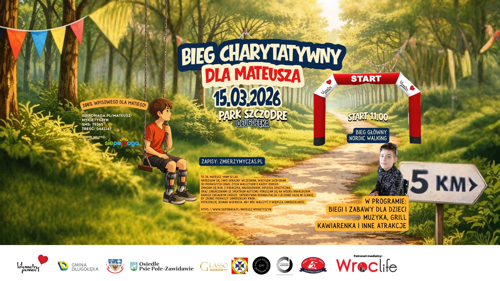 Organizatorem wydarzenia jest Stowarzyszenie Kilometry Pomocy. Całość wpisowego oraz dochód z festynu zasili zbiórkę na leczenie i rehabilitację Mateusza https://www.siepomaga.pl/mateusz-mykietyszyn
